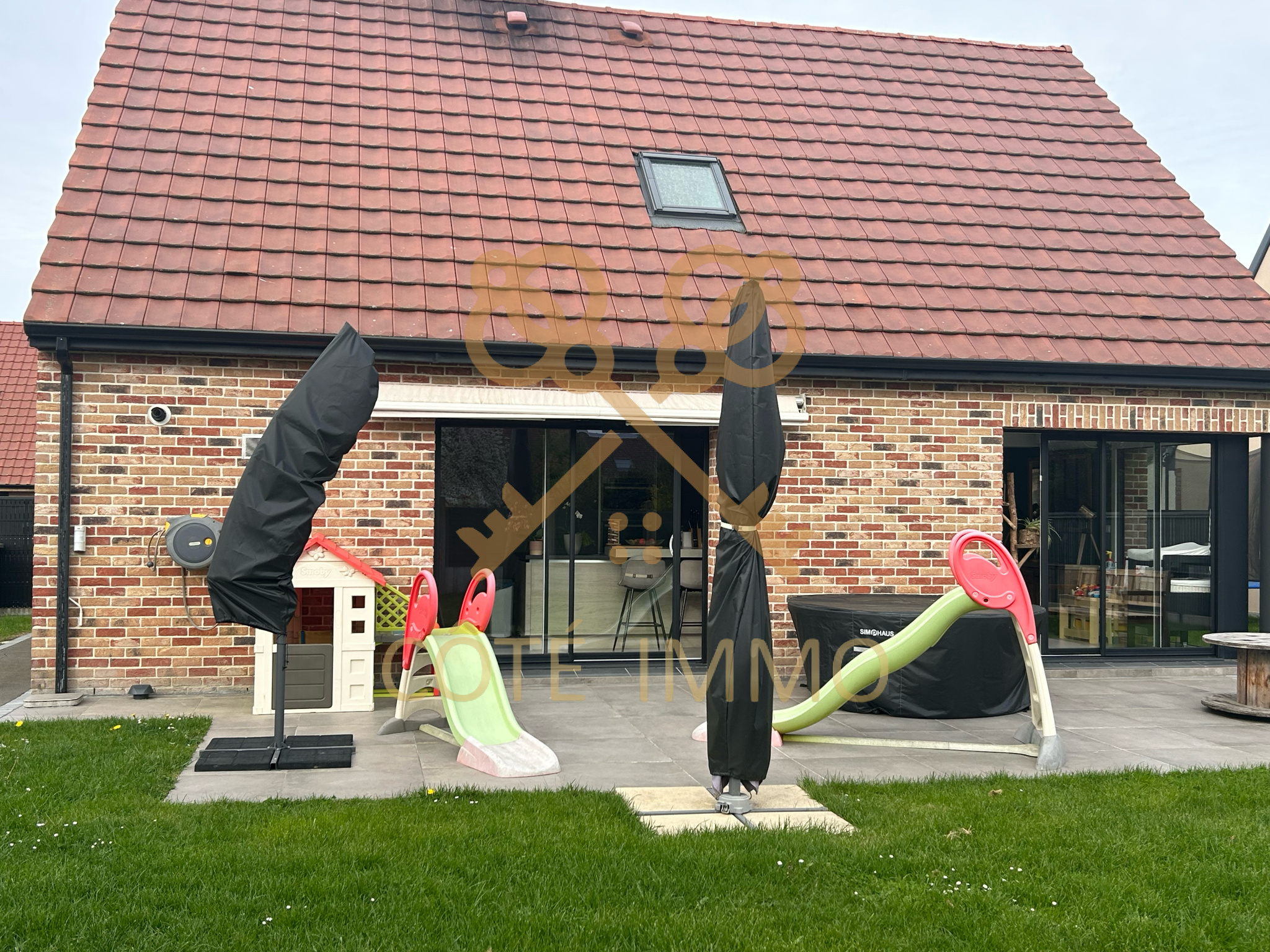 un jardin, entièrement clos et passage sur le coté s'accompagnant d'une belle terrasse, orientée, plein sud, équipé d'un store banne de qualité .