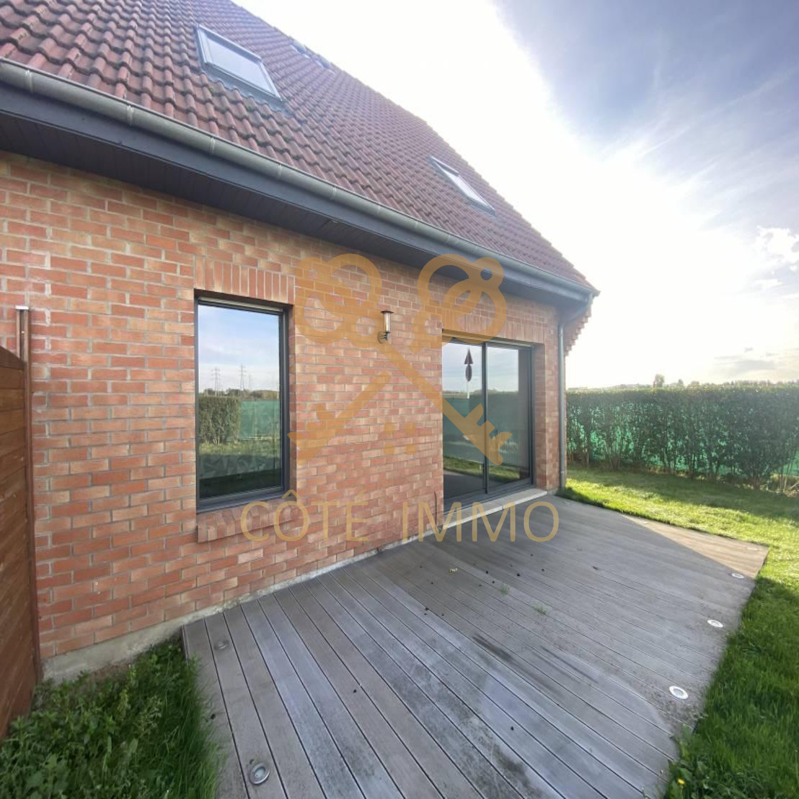 Jardin clos , terrasse en bois ,garage + parking macadamisé