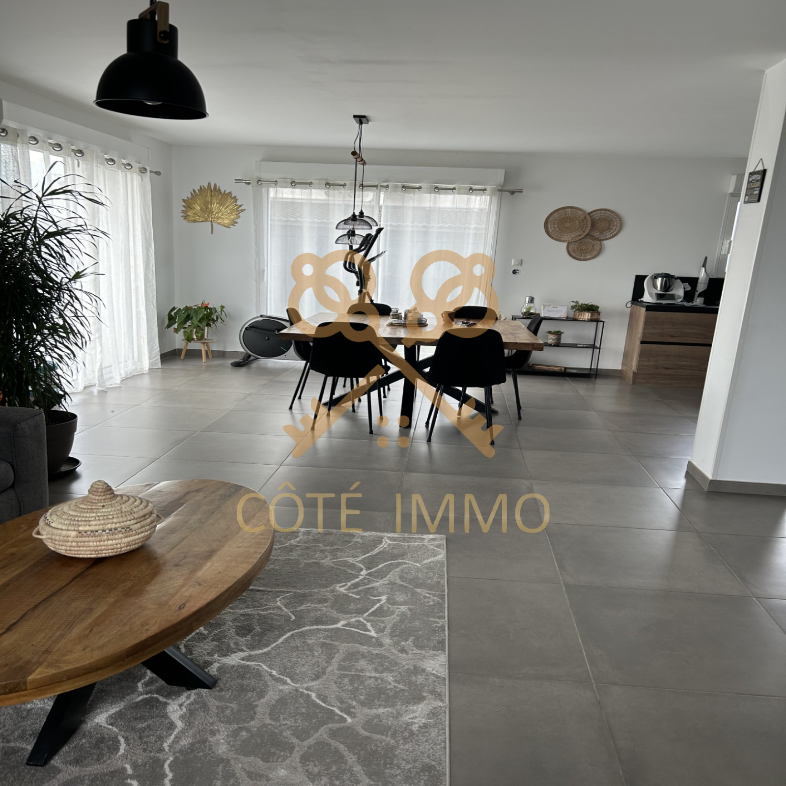 Espace de vie ouvert composé d'une partie salon, salle à manger et cuisine équipée et aménagée + cellier attenant à la cuisine et au garage.